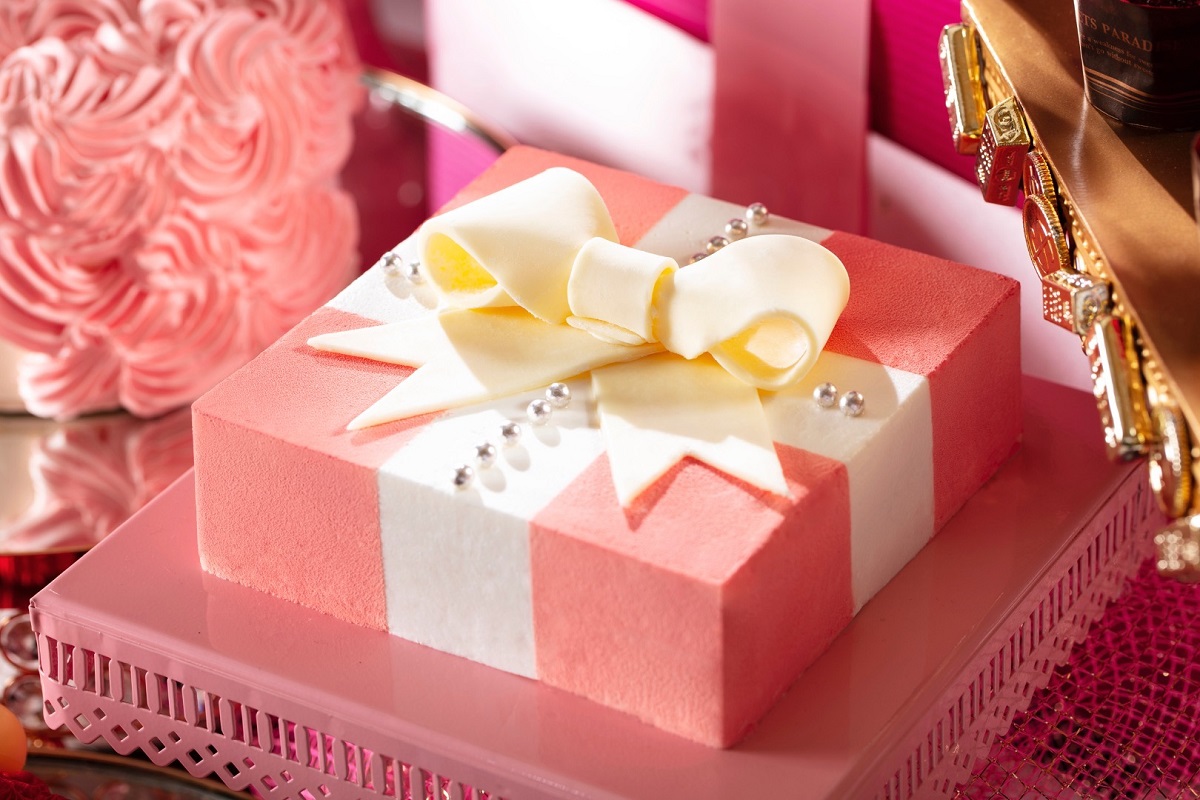 プレゼントボックスをイメージした「眠れないほどドキドキして バニラとチョコレートクリームギフトボックスケーキ」は、リボンがとってもかわいい!