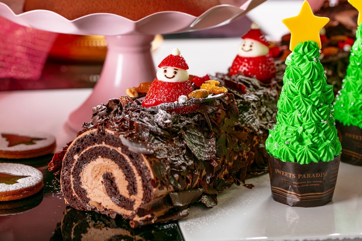 クリスマスの伝統的なスイーツ“ブッシュドノエル”にイチゴのサンタがのった「サンタを乗せて チョコレートブッシュドノエル(写真)」や「シュトレン」、ツリー型の「モーンプルンダー」なども並び、クリスマスムード満点です。