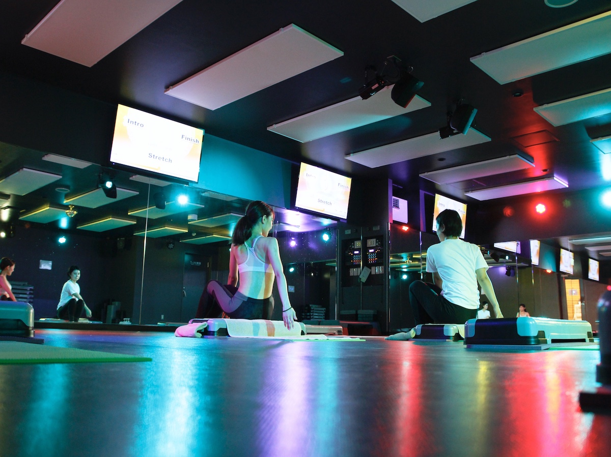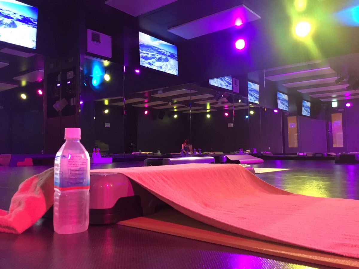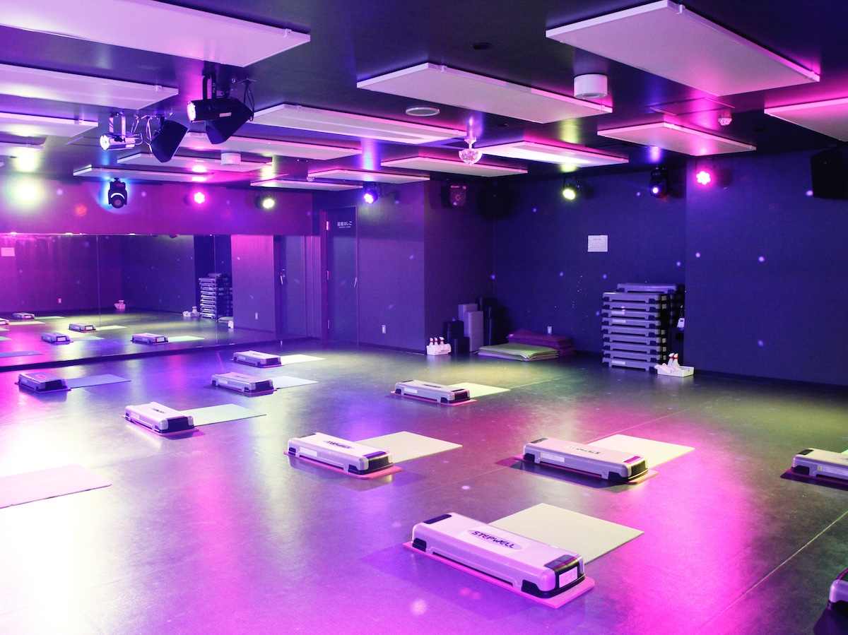 また、スタジオ内はミラーボールやライティングがクラブのような雰囲気で、気分が高まります。その中に並べられているのが、ステップ台。この台を使ってエクササイズを行います。
