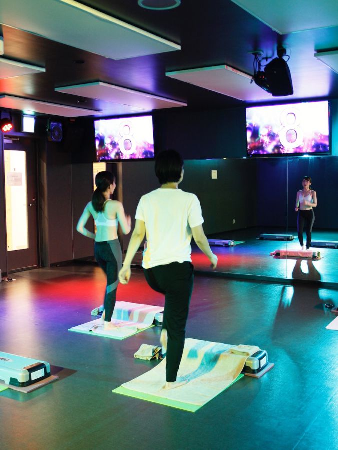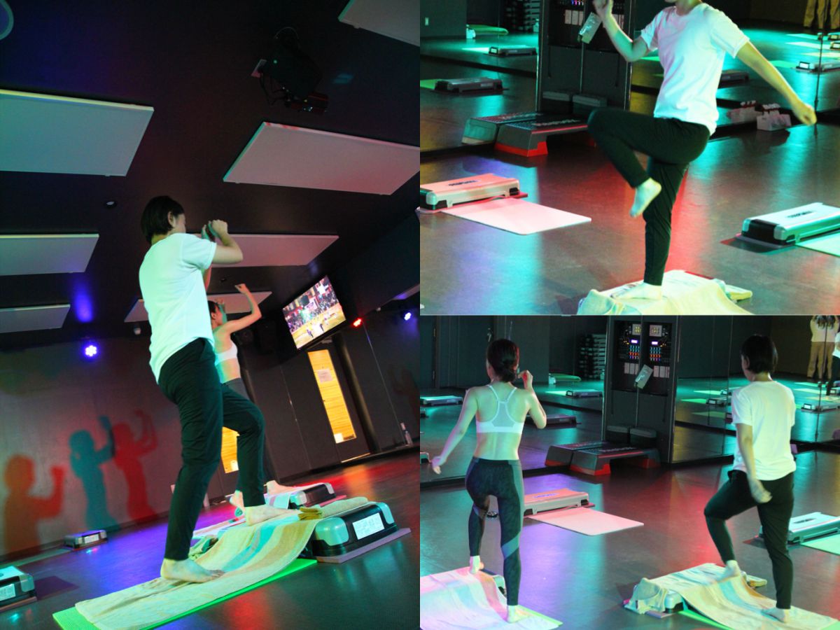 連続100回のステップも、クラブさながらの大音量の音楽にのって行うので、驚くほどあっという間!また、100回のステップが終わるごとに、3 分の休憩があるので、スタジオ外に出て涼むこともOK。体力に不安がある人でも無理なく行えます!