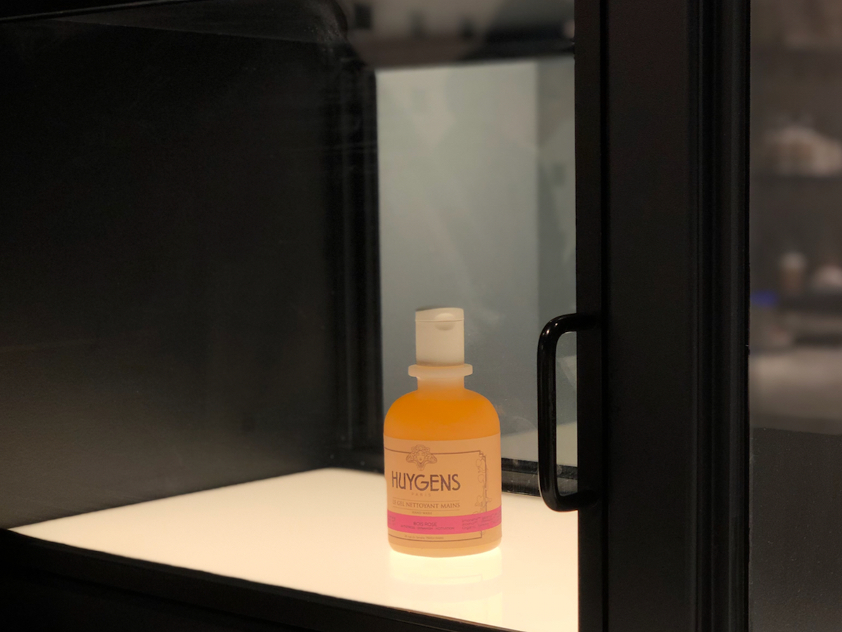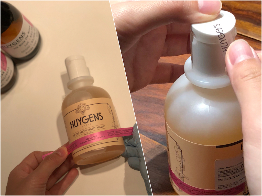 次はボディウォッシュ、ハンドウォッシュ、フェイスウォッシュの3つから選んだアイテムに、香りを添加します。今回はハンドウォッシュをセレクト。「HUYGENS」のウォッシュ系アイテムは、潤いながら汚れを落とす発泡剤フリー仕様のため、保湿効果が段違いで持続するんだとか。