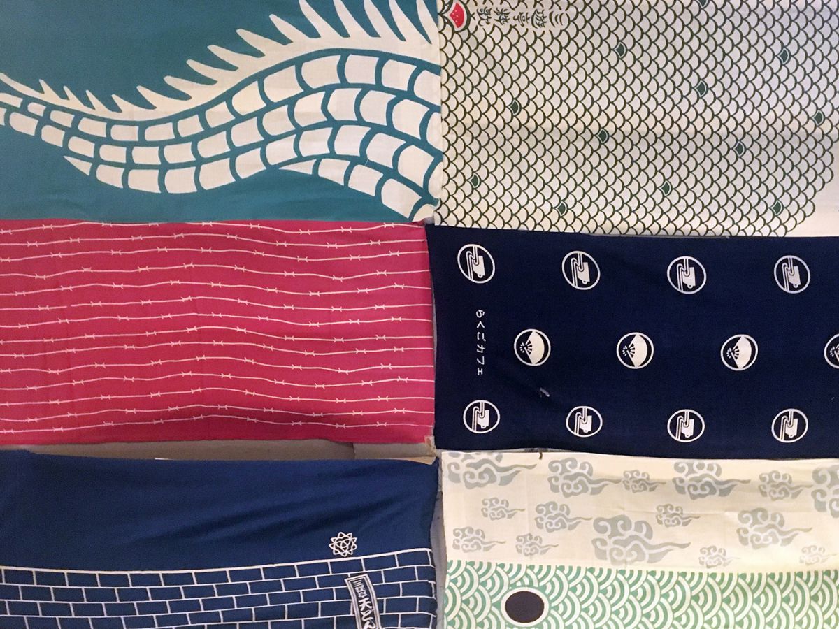 カフェの天井には、落語家の千社札や手ぬぐいがたくさん貼られていて、柄を見ているだけでも楽しいものです。カフェオリジナルの手ぬぐい(800円)も販売しています。