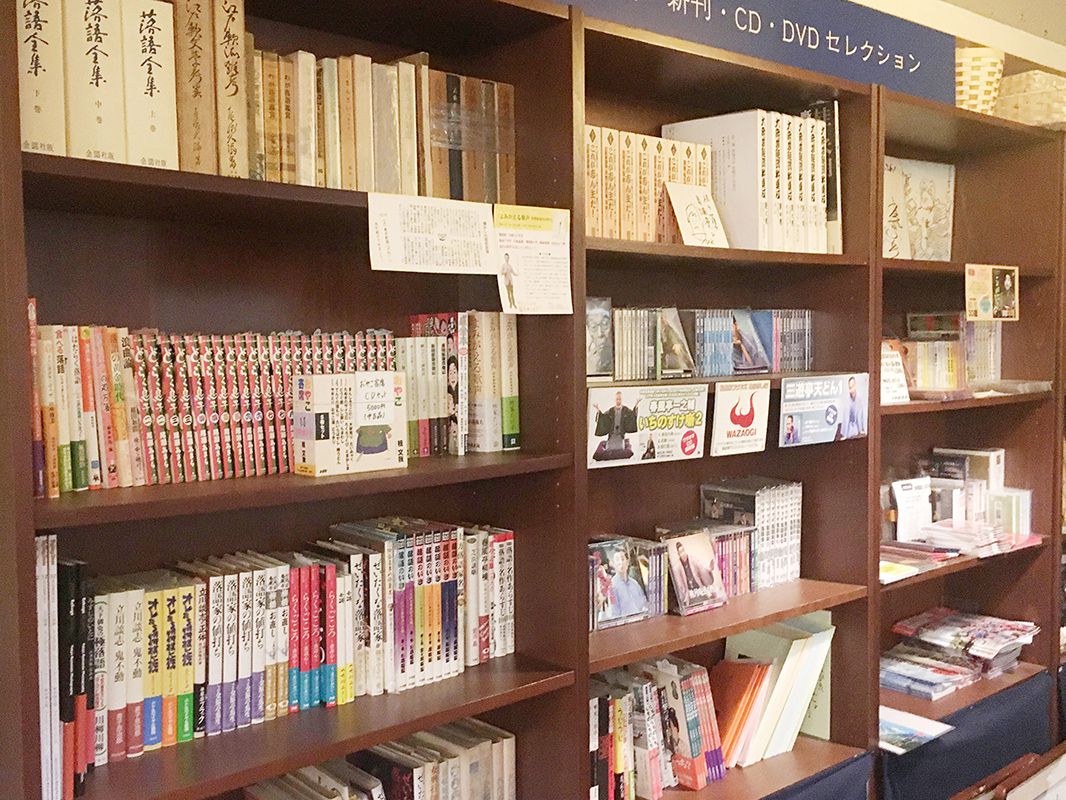 落語に関する書籍、CDやDVDがずらりと並び、購入もできます。近くにある古本屋さんが集めてくれた本も多いそうで、初心者からマニアまで満足できそうなラインナップ。