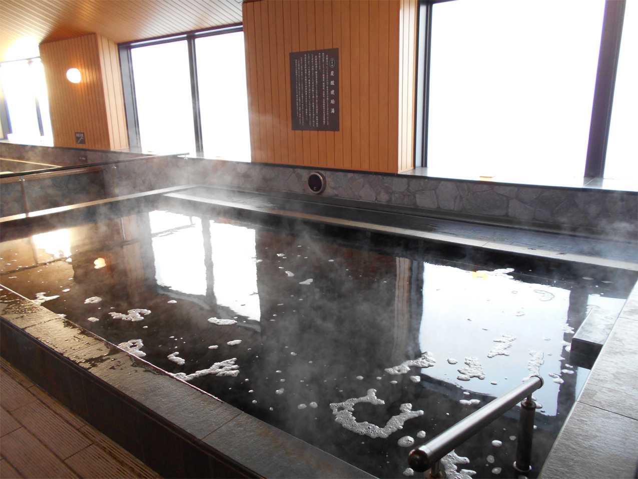 続いては、黒褐色のお湯が特徴的な源泉かけ流しの露天風呂。こちらも美肌に効果的なナトリウム-炭酸水素塩を含んだお湯で、肌をなめらかにしてくれるそう。