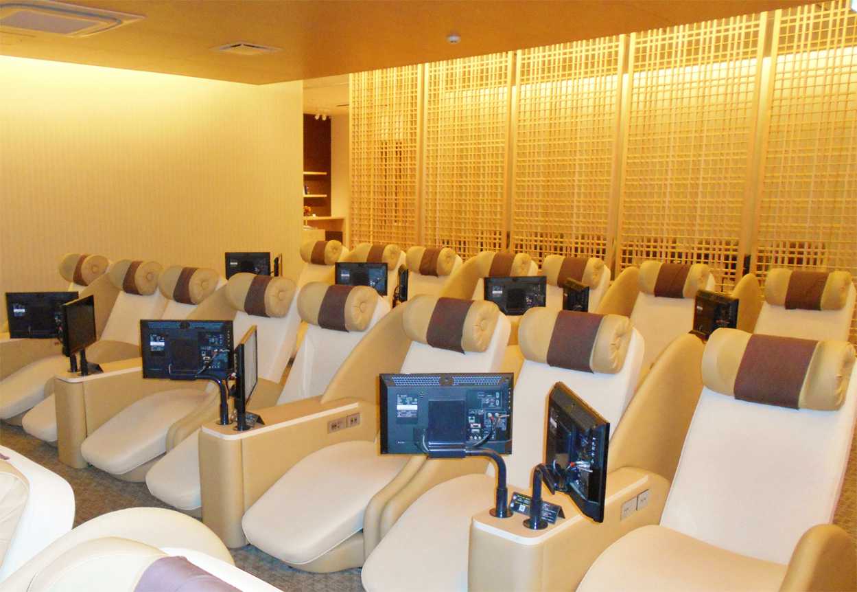 <TV付きのリクライニングチェアが完備されたお休み処。女性専用スペース(23席)もあるので安心してくつろげます。また、マッサージやエステなどのリラクゼーションサービスのほかに食事処も充実!まさに至れり尽くせりの至福のひとときが味わえます。