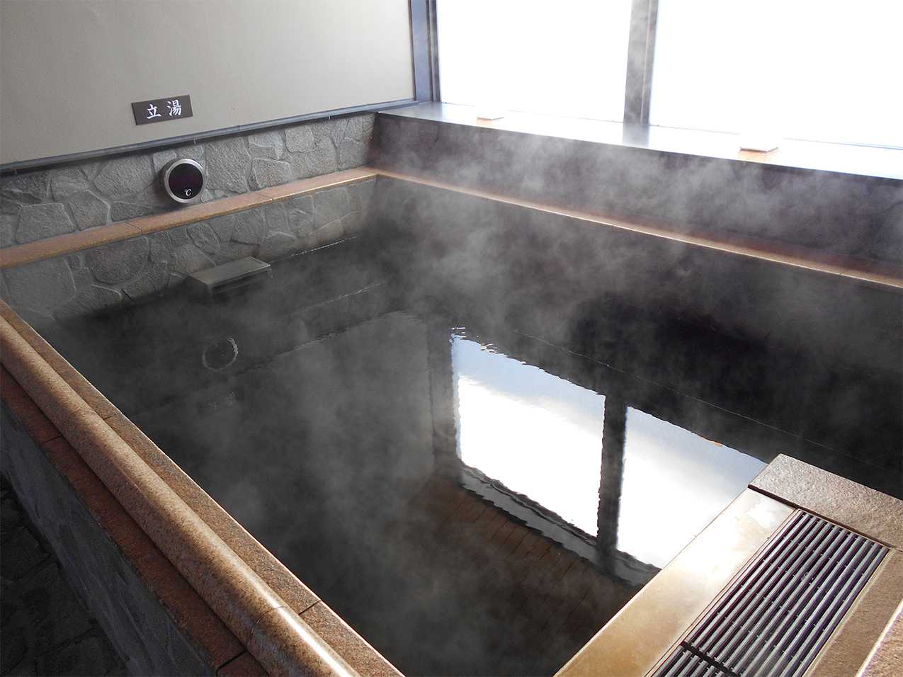 こちらの「立湯(たちゆ)」は、文字通り立ったままお湯につかるお風呂で、深さは120cmもあります。お湯は先ほどと同じく美肌効果のある黒湯。ちなみに、この立湯は女性風呂限定です。