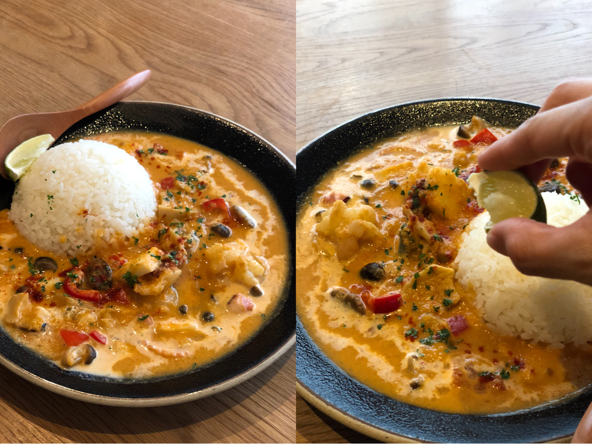 写真は看板メニューの、海鮮シチュー「ムケッカ」(1080円)。クリームシチューのような見た目ですが、一般的なシチューとはひと味違うココナッツ独特の甘みが特徴。スパイスが味を引き締め、甘みがありつつもご飯に合う味に仕上げられています。