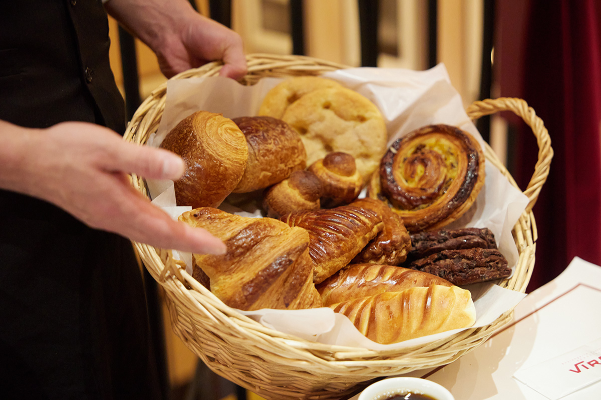 「ヴィロンの朝食」は、「バケットレトロドール」「セレアル」「トゥルト・ドゥ・セーグル」の3種類のハード系パンのほかに、好きなヴィエノワズリー(菓子パン)を1種類選ぶことができます。オーダーすると、スタッフがカゴに盛られたヴィエノワズリーを席まで持ってきてひとつひとつ説明してくれ、選んだパンをトングで提供してくれます。