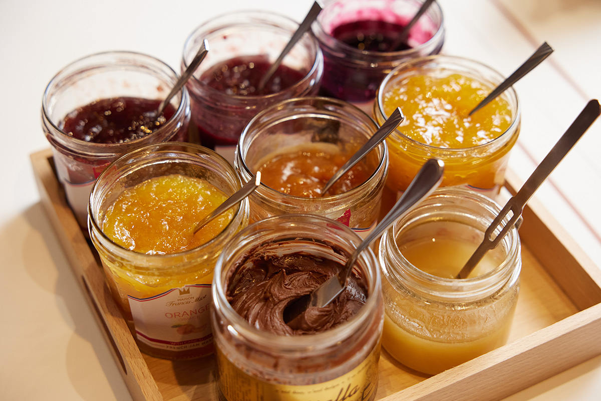 モーニングでは、6種類のジャムとはちみつ、チョコレートクリームが用意されており、好きなだけ付けることができます。ジャムはフランスの高級ジャムであるミオ社のもの。取材時は、オレンジマーマレード・ピーチ・アプリコット・ブルーベリー・ラズベリー・いちごの6種類でした。どのフレーバーのジャムが出されるかは、その日のお楽しみだそうです。