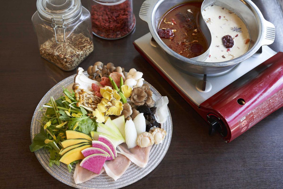 「疲労回復 国産烏骨鶏スープ」「デトックス火鍋スープ」「美肌豆乳スープ」「季節の薬膳スープ」の4種類から2種類のスープを選べるシステム。