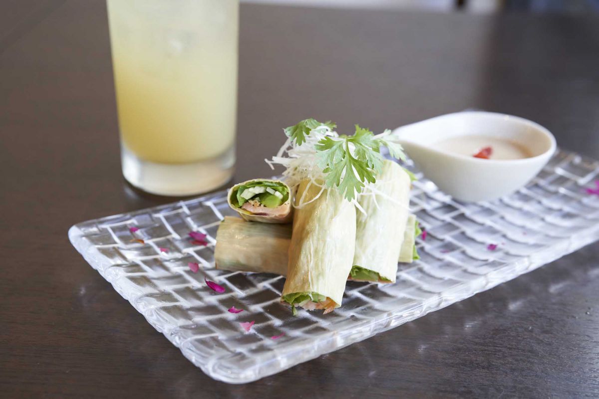 低糖質な“湯葉”で巻かれた香ばしい燻製サーモン・金針菜・アボカドを濃厚な豆乳のチリソースでいただきます。