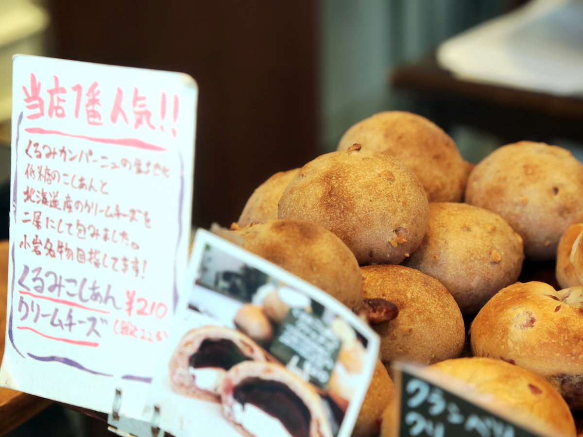 お店の1番人気は、「くるみこしあんクリームチーズ」(226円)。くるみ入りのカンパーニュに、北海道産のクリームチーズを二層にして包み、外をこんがりと焼き上げたお店の名物メニューです。コロンと丸いパンの中には、クリームチーズとこしあんがぎっしり!