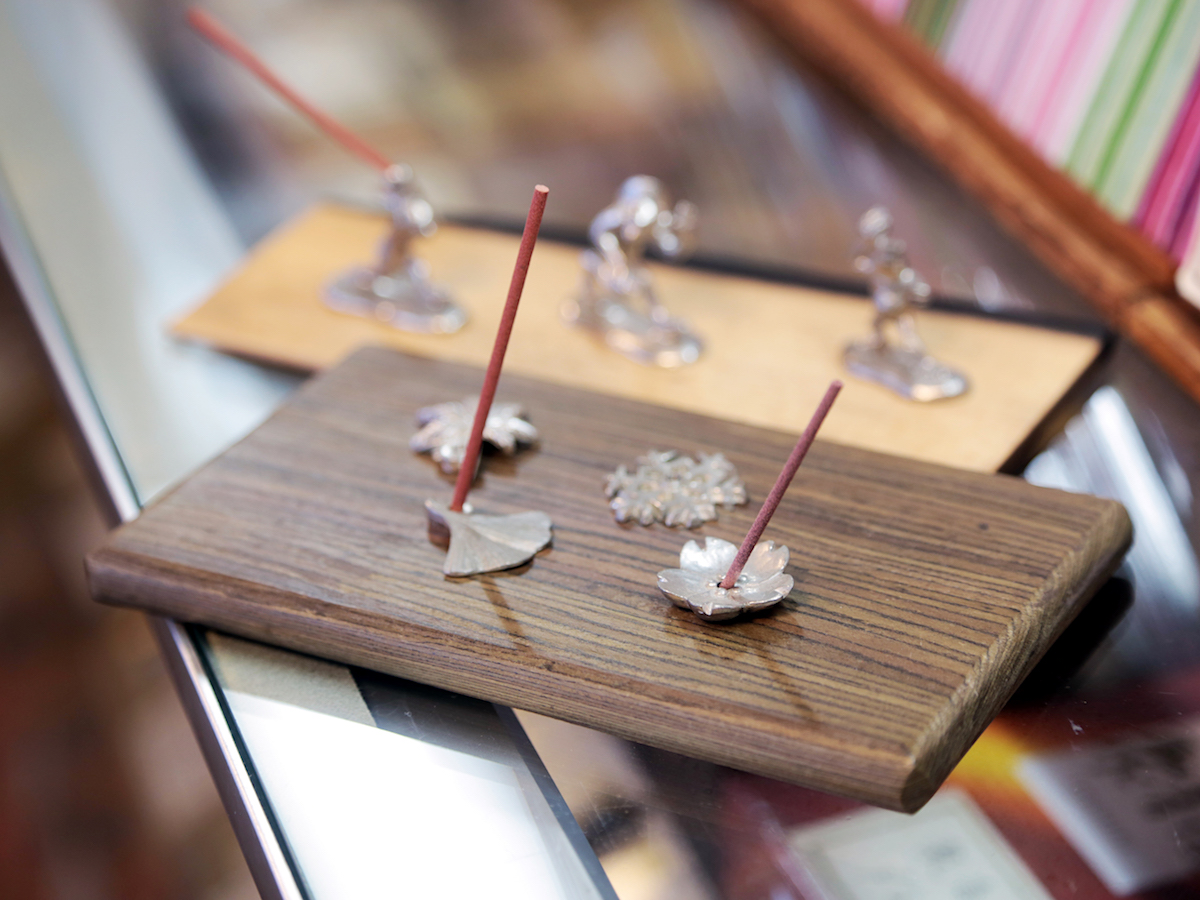 人気はスティックタイプのお香やお線香。白檀など伝統的な香りのほかにも、「コーヒーの香り」「桜の香り」などバリエーション豊かです。トレンドは、マンションでも焚きやすい煙が少なく香も控えめなタイプ。お香立てや香炉など、お香を楽しむためのさまざまな道具も充実しています。