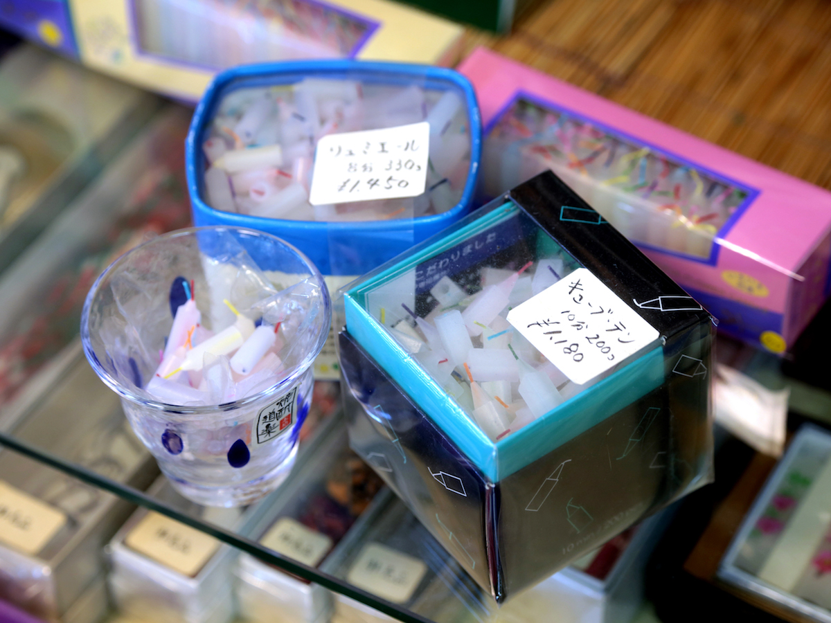 店内には、美しい花が描かれた和ろうそくやキャンドルも。写真のような、蝋が残らず煙も少ないミニタイプのろうそくも人気商品の1つだそうです。小さくてカラフルな見た目がかわいい!