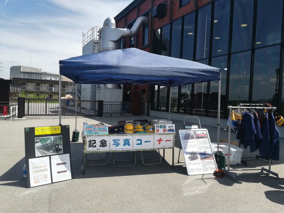 不定期開催ですが、機関士や乗務員たちが着ている制服や帽子をかぶって、写真を撮ることができる無料の記念写真コーナーがあることも。SL大樹のヘッドマークのパネルを持たせてくれたり、おすすめの撮影ポイントを教えてくれたり、ポストカードのプレゼントがあったり、サービス満点です。