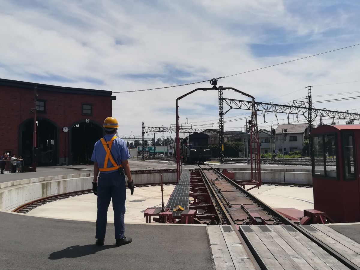 SLが転車台にのると、時計回りに回転がスタート。時折、汽笛を鳴らしたり、煙を上げながら、ゆっくりゆっくり回るSLの大きさや迫力に圧倒されます。