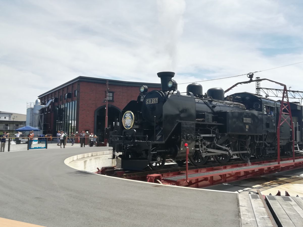 このSLは、昭和16年(1941)に製造された蒸気機関車C11-207。昭和49年(1974)にいったん廃車になったのですが、平成12年(2000)からJR北海道で活躍していたものです。正面にライトが2つ付いたカニのような目が特徴です。