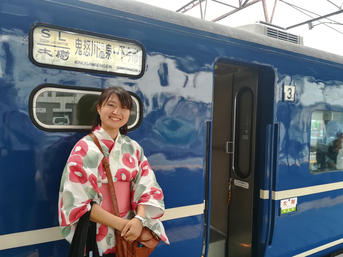 さらに、客車1両に1名のSL観光アテンダントが乗車して、乗客のお出迎えやお見送りをしてくれます。通常は制服姿なのですが、この日は夏らしく浴衣でおもてなし。