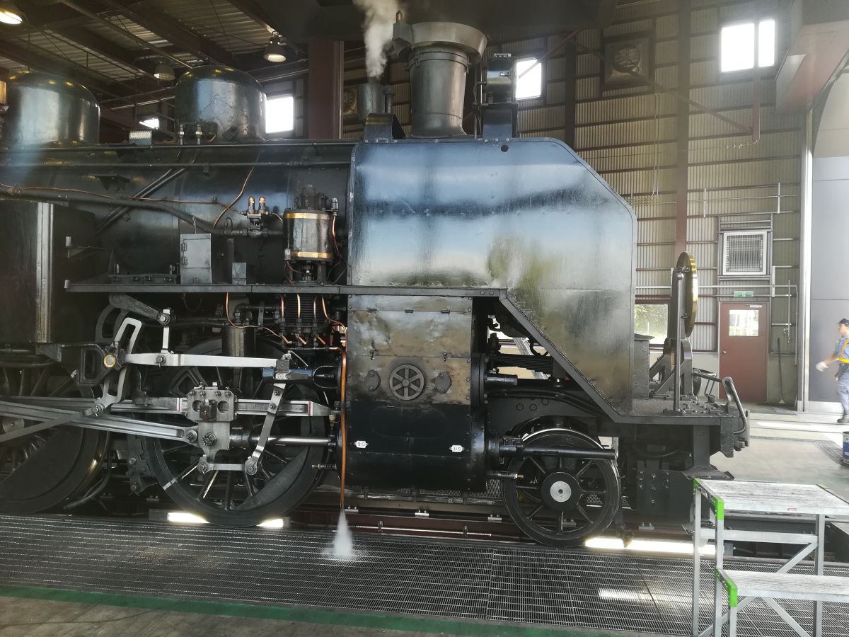 機関庫の側面はガラス張りになっていて、SLを点検したり、整備している様子や動輪部分などの複雑な造りなどをじっくり見ることができます。