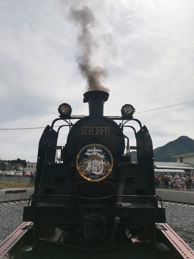 モクモクと煙を上げながら、温泉街に大きな汽笛が鳴り響きます。たまたま通りかかった観光客もみんな一緒になって、夢中で写真撮影!