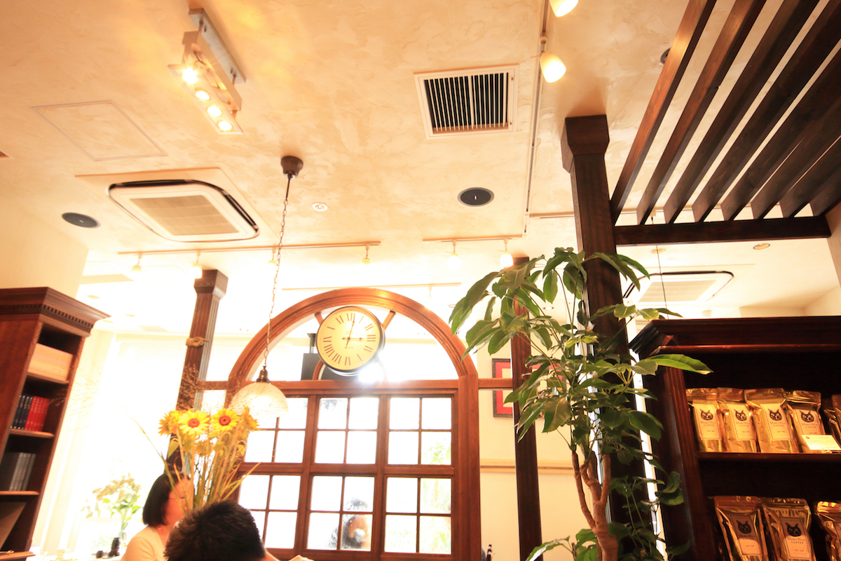 暖色系の照明と外から差し込む日光がテーブルを照らし、店内中央のレトロな時計が時を刻む…。ノスタルジックな雰囲気の中で、ゆっくりとカフェタイムを楽しめます。