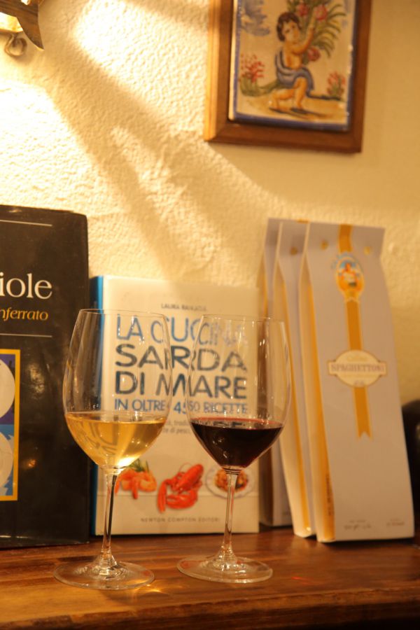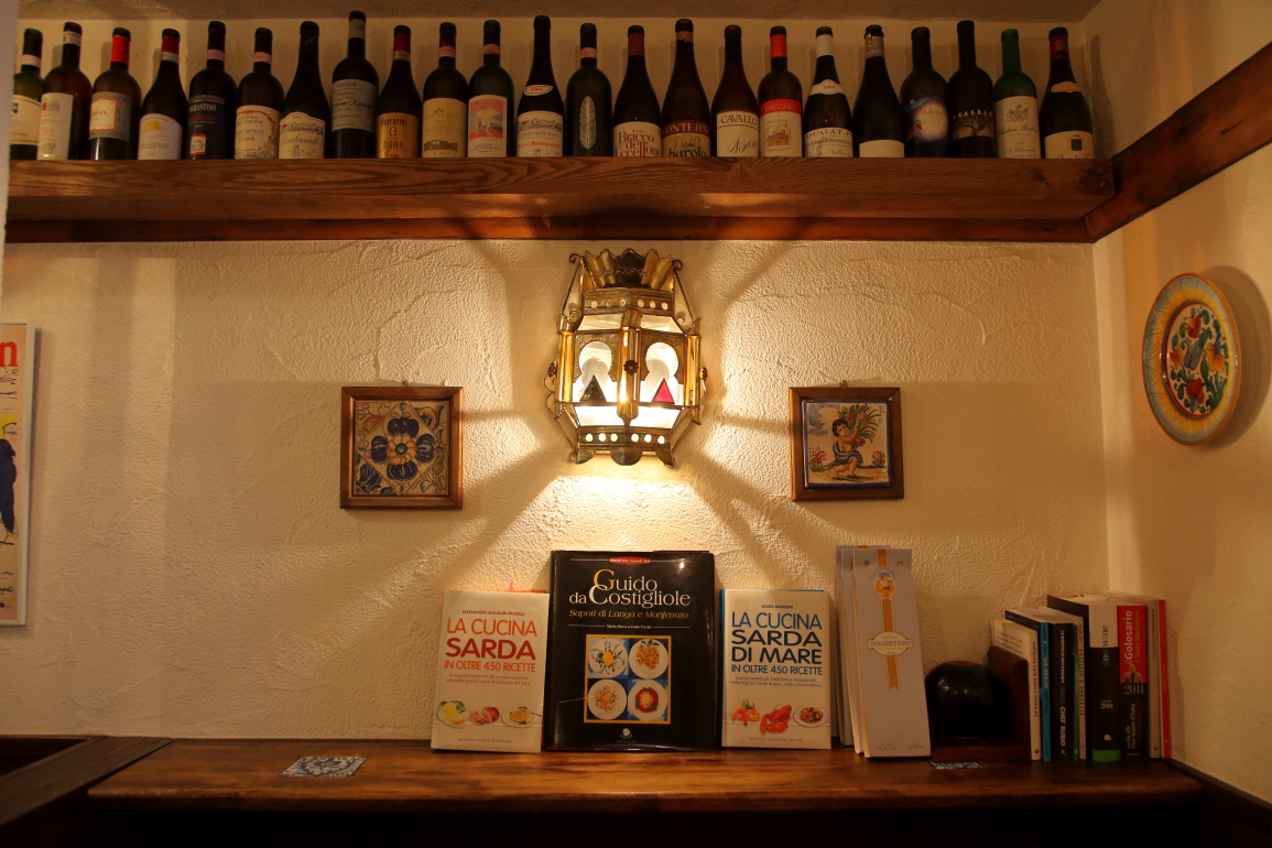 店の一角には、温かな光を放つライト、ずらりと並ぶワインボトル、イタリア語の料理本などが。何気ない演出がステキです!