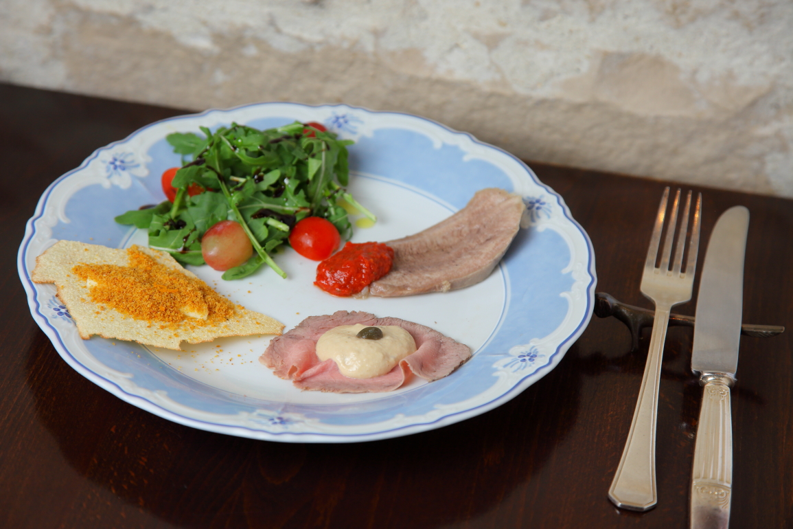まずは冷菜の盛り合わせ。薄焼きパン(パーネカラザウ)にサルディーニャ産のカラスミとバターをのせたもの、牛もも肉のスライスのアンチョビ&ケッパー入りツナソースのせ、牛タンスライスのパプリカ&トマトペースソース添えの3種類。