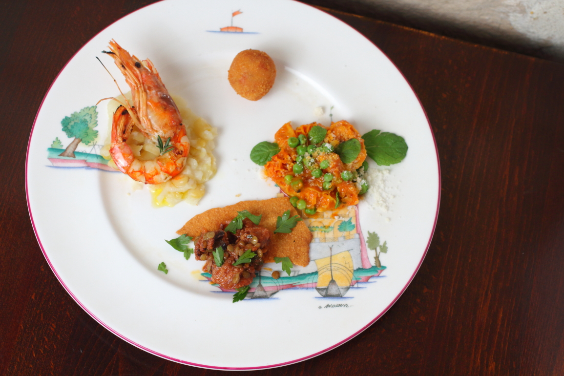温菜の盛り合わせは、その日の仕入れによって3~4種類がお皿に盛られます。取材日は、イイダコのトマト煮込み、ひき肉で包んだオリーブのフリット、田舎風トリッパの煮込み、赤エビのグリルの4品。