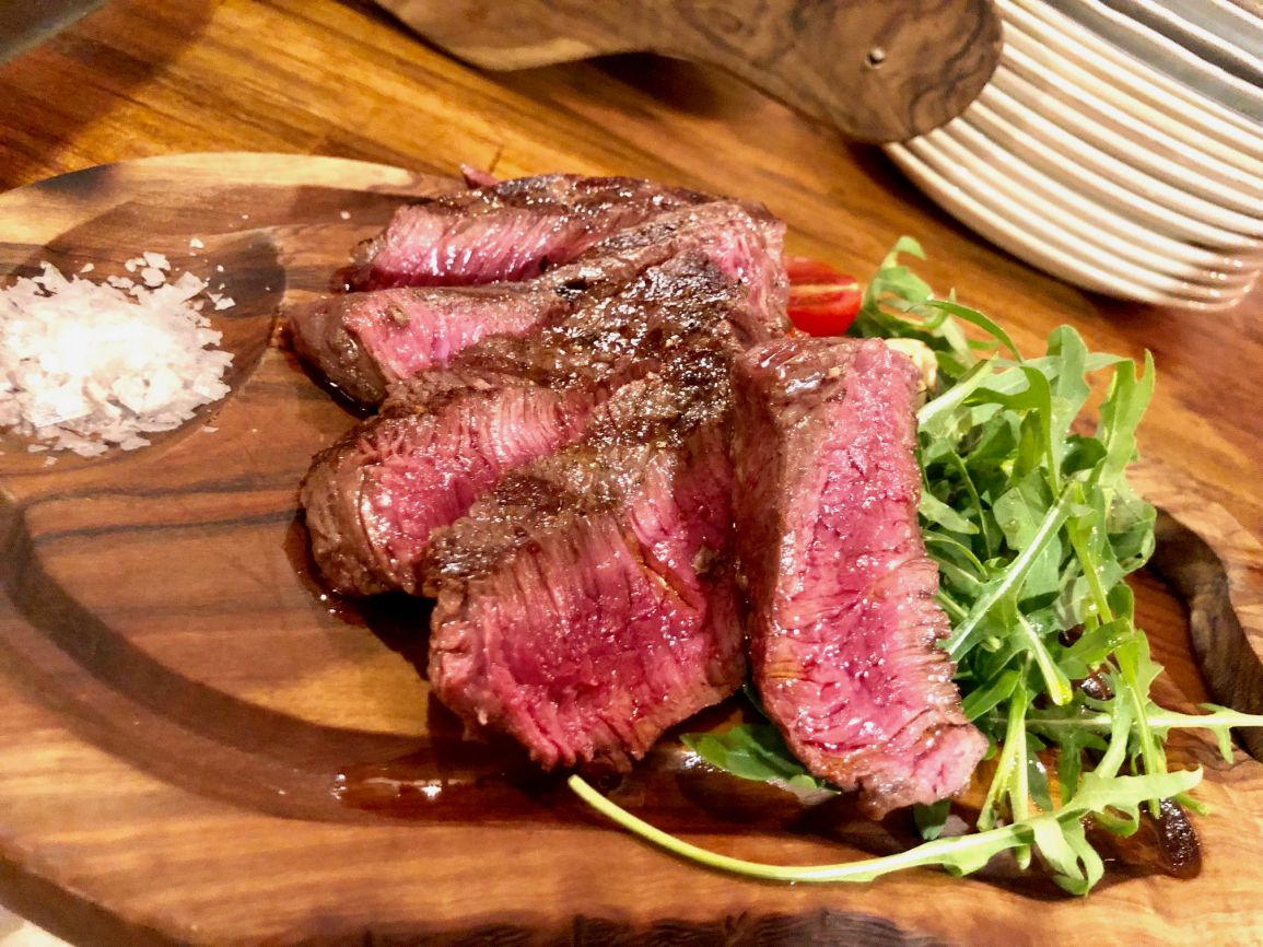 メインは、「国産赤身牛のタリアータ」。タリアータとは牛肉をサッと焼いて薄切りにしたステーキのこと。肉本来の味が楽しめるように、塩でシンプルに味わいます。ジュワ~っと広がる肉汁がたまりません!