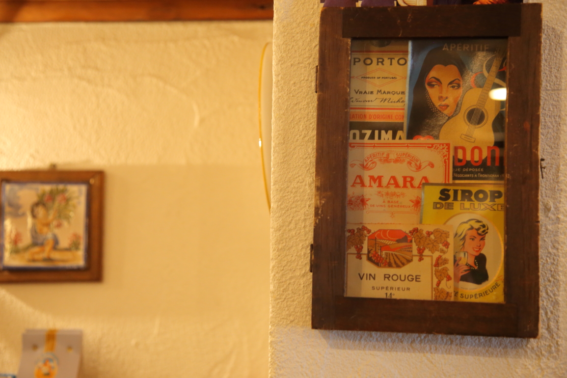 こちらは、かなり古いワインのラベルを組み合わせたもの。お店に訪れたらぜひチェックしてみてください。