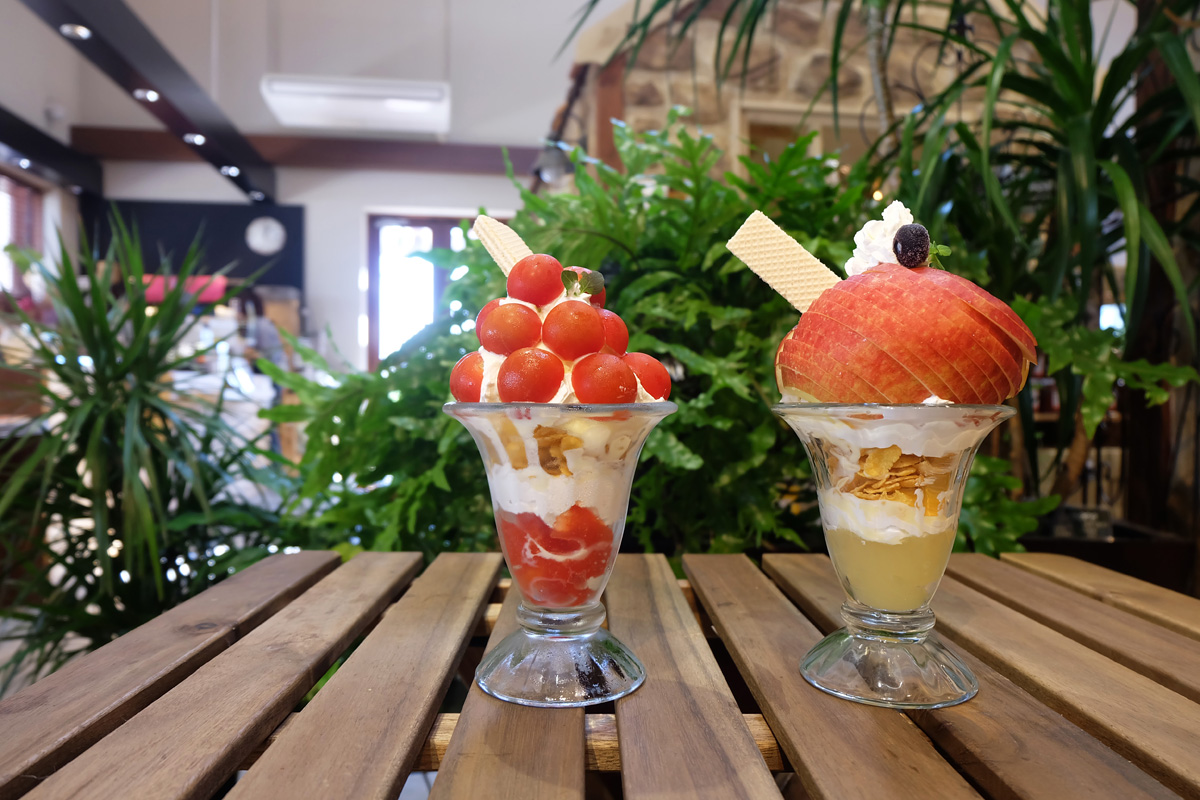 9月末に新登場した「まるごとフルーツのかまくらパフェ」もおすすめ。左は、ミニトマトをふんだんに使った新感覚の「トマト&クリームチーズ」(750円)。トマトとクリームチーズが相性抜群で見た目もキュート!右は、皮付きリンゴを丸ごと1個使ったパフェ(850円)。パフェ好きにはたまらないメニューです。