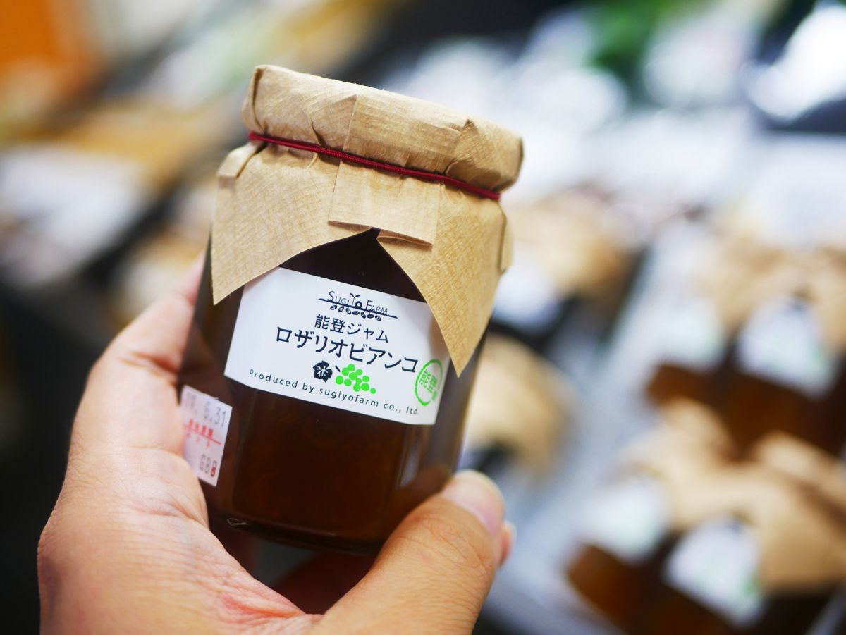 お買い物ゾーンには、レストランでもいただける「ノンオイルドレッシング」(648円~)や手作り「能登ジャム」(500円~)など、自社農場の野菜や果物を使ったオリジナル商品を種類豊富に取り揃えています。特にぶどうジャム「ロザリオビアンコ」などのは全国的にもレアな一品。その日の収穫次第で、野菜や果物が並ぶこともあるそうです。
