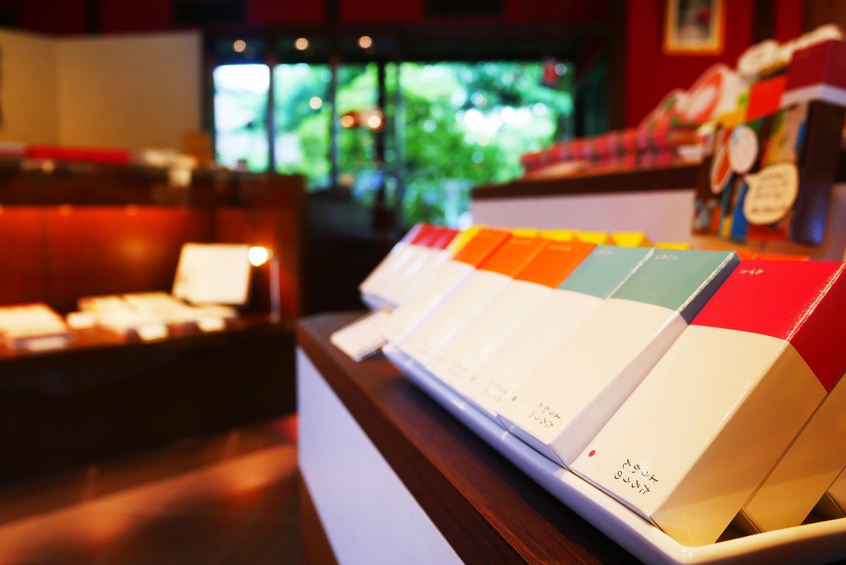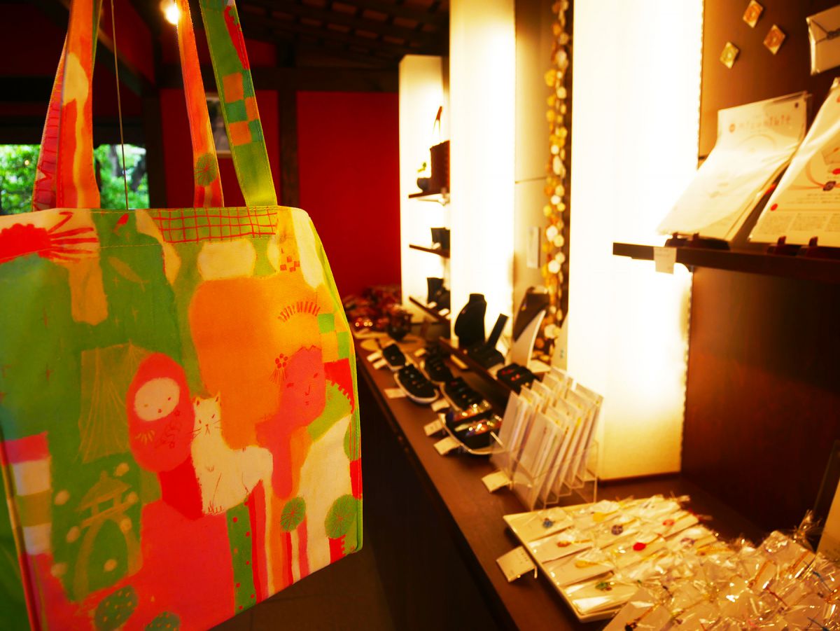 店内には、「はなことたろう」のパッケージをプリントしたオリジナルバッグなどグッズの販売コーナーも。庭園を含め、アート好きも大満足の和菓子処です。