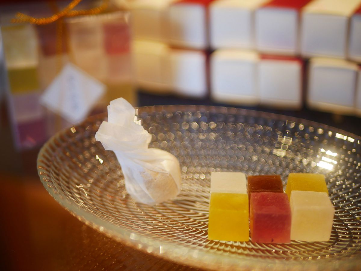 丹波産糸寒天をじっくり乾燥させたサイコロサイズの「もりの音(13粒入り378円」は、カリッとした食感と柔らかな弾力が特徴のお菓子。紅白の化粧箱はちょっとしたお祝いでも喜ばれそう。