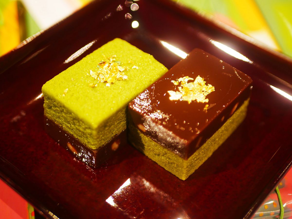 カカオチョコのようかんと蒸した抹茶カステラを重ねた「はなことたろう(5個入り950円)」は、砕いたアーモンドが香ばしく、コーヒーとの相性もぴったり!金箔をふりかけたさりげない華やかさがおみやげとしてウケています。