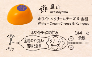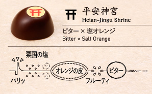 たとえば、平安神宮のショコラ。パリッとコーティングされたチョコをかじると、最初に粟国の塩のまろやかな塩気が感じられ、あとからオレンジのフルーティーな酸味と香りがふわっと広がります。