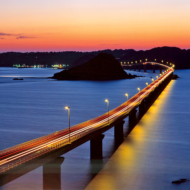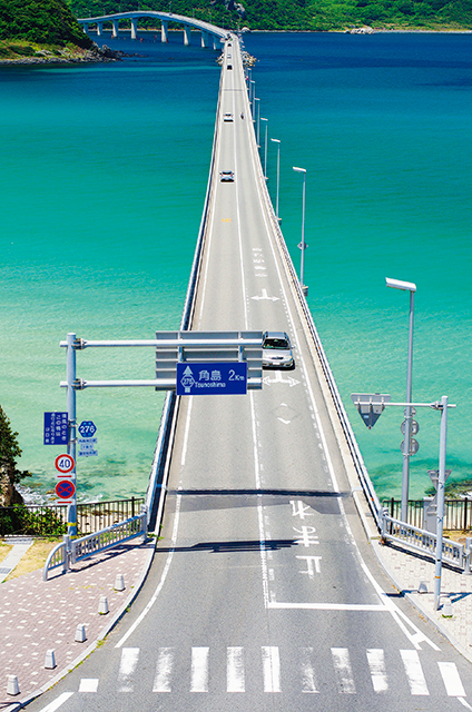 白い砂浜、エメラルドグリーンの海。角島は、日本海とは思えないようなリゾート感あふれる景色が広がる山陰屈指の美景エリア。映画やCMのロケなどでも多く使われ、有名な観光スポットになっています。角島エリアのシンボル、全長1780mの角島大橋は絶好の撮影ポイントとしても人気。
