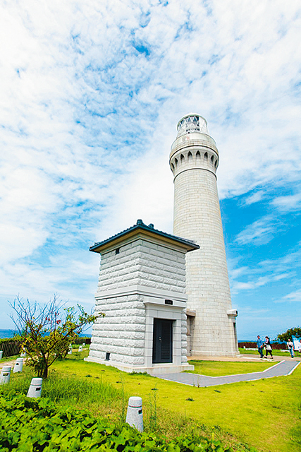 角島の西の先端にある角島灯台公園は、日本初の洋式灯台・角島灯台を中心に整備された公園です。明治9年(1876)の初点灯から130年以上たった今、なお現役で海を照らし続ける灯台は、総御影石造りで趣のある雰囲気。中のらせん階段のおどり場までは入って見学することができます。公園から望む日本海の眺めも最高!