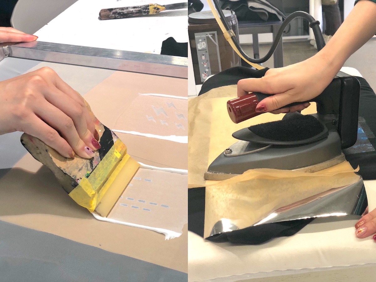 Tシャツの上に型紙を置いて、上から専用ののりを塗り、その上に銀箔をのせ、最後にアイロンをかけます。のりの上にきちんと箔がくっつくように、10秒間じっくりと。そして、銀箔をはがすと…。