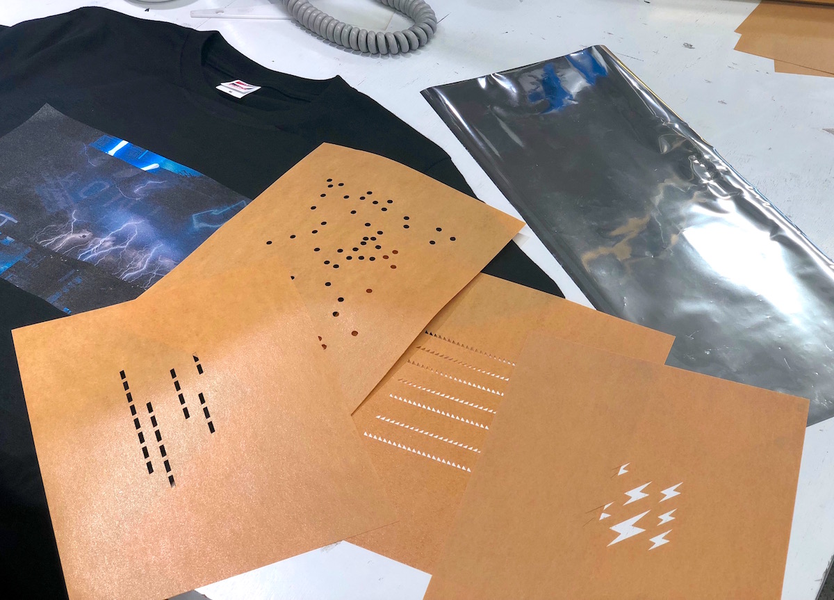 続いて、数種類の型紙の中から好きなデザインを選びます。箔押しの配置も、全体の印象を左右する大切な要素。Tシャツの上に型紙を置いて、何パターンもシミュレーションをします。