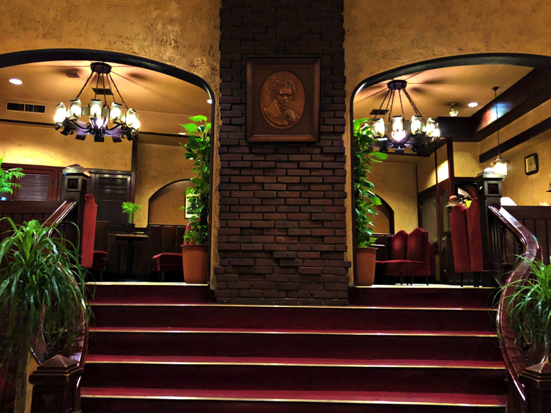 1950年創業という長い歴史をもつ「らんぶる」。元が名曲喫茶ということで、店内のいたるところに著名な音楽家たちの肖像画が飾られています。中央の大きな柱には、ベートーヴェンを発見。