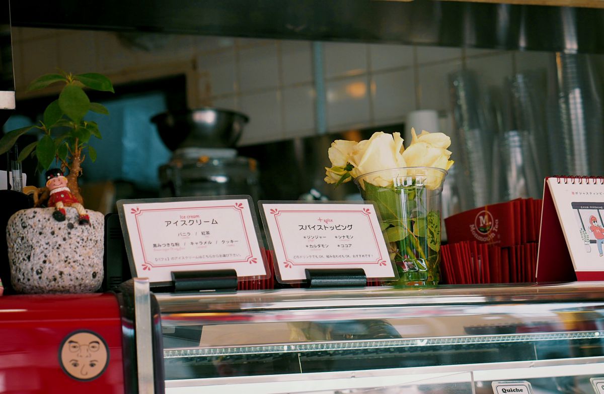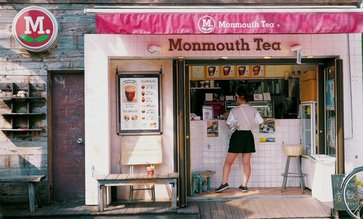 千駄ヶ谷駅から歩くことおよそ10分。なにやら人が列をなしているスタンドを発見!ボルドー色の看板が目印のこちらが、ウワサの「Monmouth Tea」です。おしゃべりをしながらドリンクを片手に午後のひとときを楽しむお客さんでいっぱい!和やかで親しみやすい雰囲気のお店です。