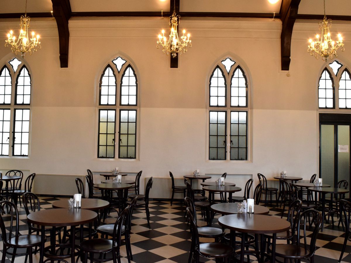 かつての礼拝堂がカフェになるとこんなに素敵に。高い天井にはシャンデリア、ポインテッドアーチ型の大きな窓から日が差し込むと幻想的な雰囲気です。