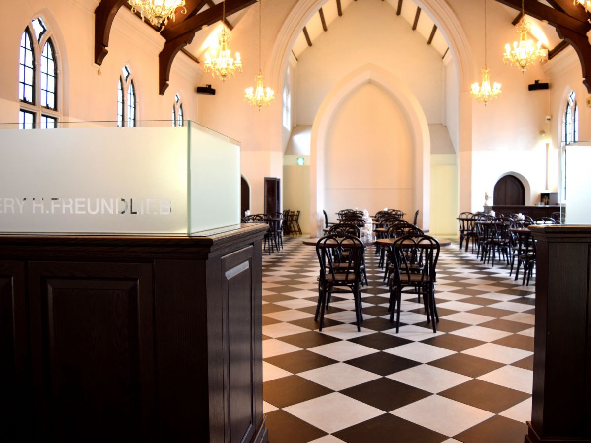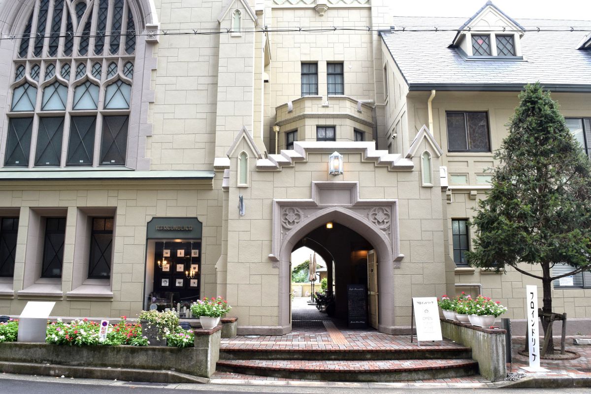 有名な建築家、ウィリアム・メレル・ヴォーリズが設計した旧神戸ユニオン教会が、1999年にフロインドリーブの新店舗に生まれ変わりました。気品あふれる教会の趣はそのままに、入口を入ると左が店舗、奥には中庭があって、ヨーロッパのような雰囲気です。