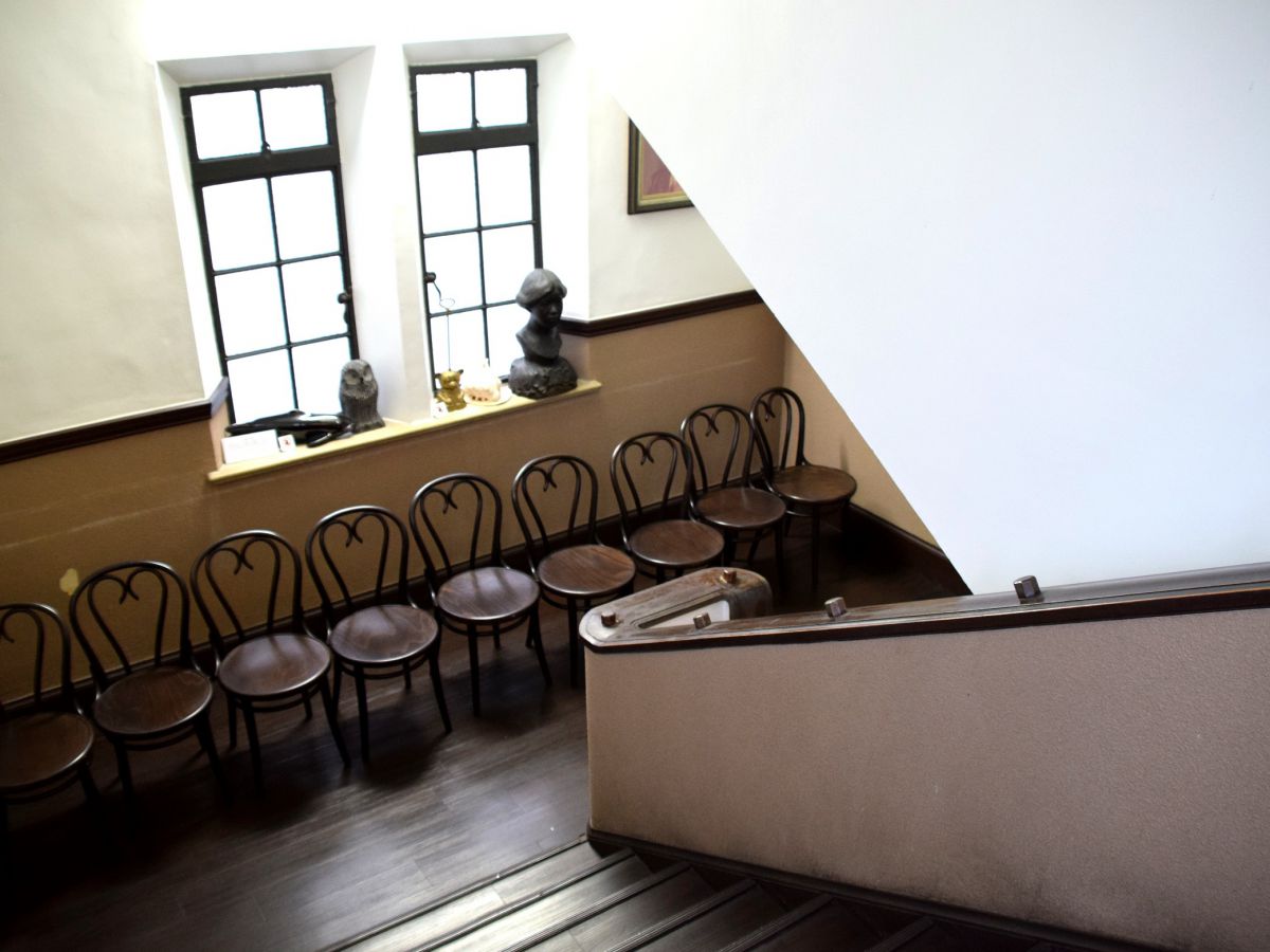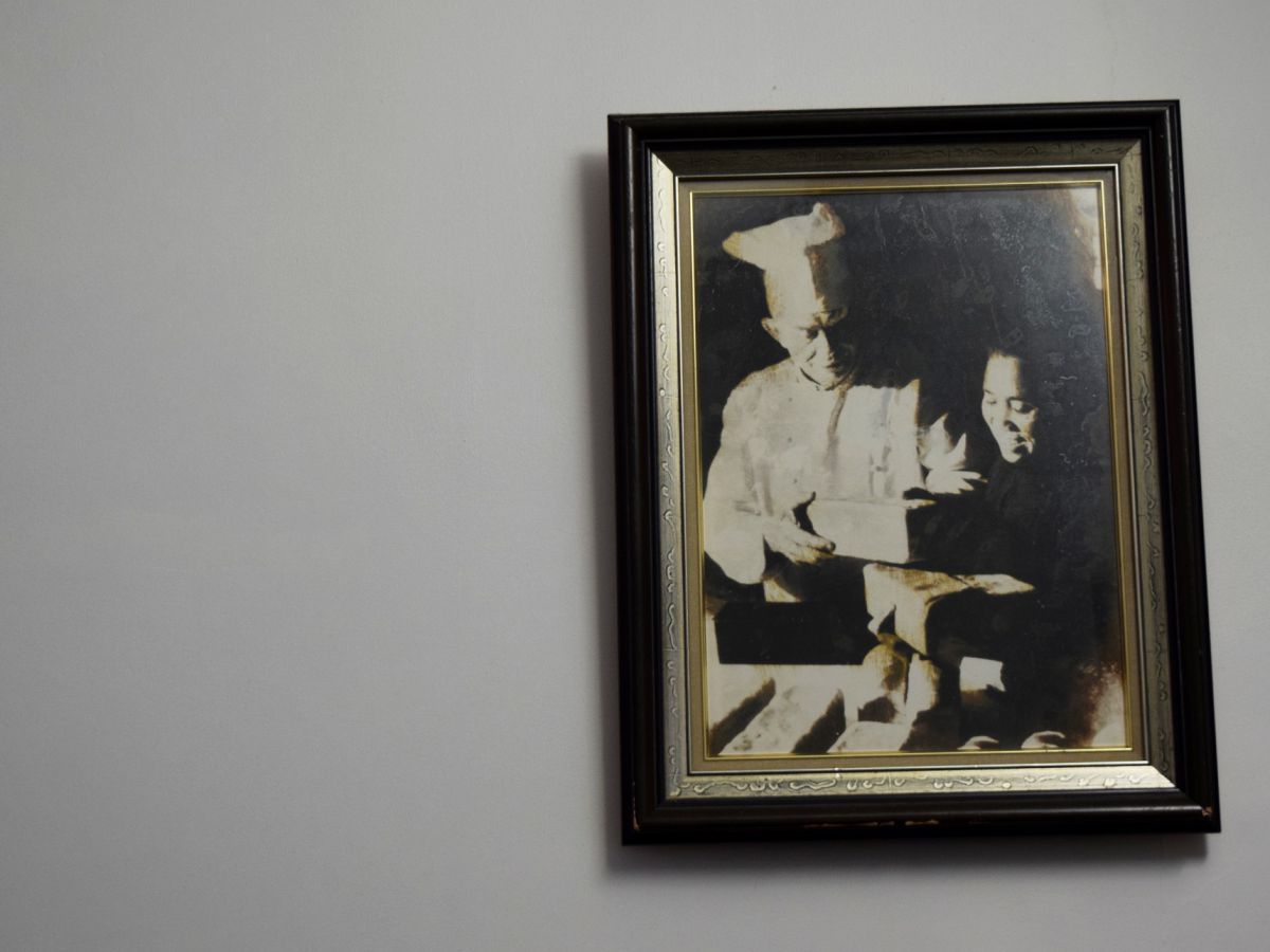階段の踊り場に飾られているのは、創設者のハインリッヒ・フロインドリーブ氏とその妻ヨンさんの写真。ドラマのモデルになったことでも知られています。