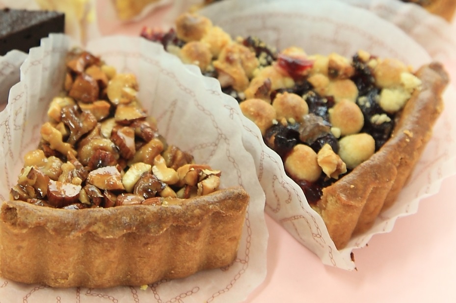 タルトはチョコやチーズ、木の実、クランベリーなど、定番6種類のほか、その季節によって和栗やリンゴ、桃など限定タルトも登場します。サクサクしたタルト生地と、中のしっとりした生地が絶妙。