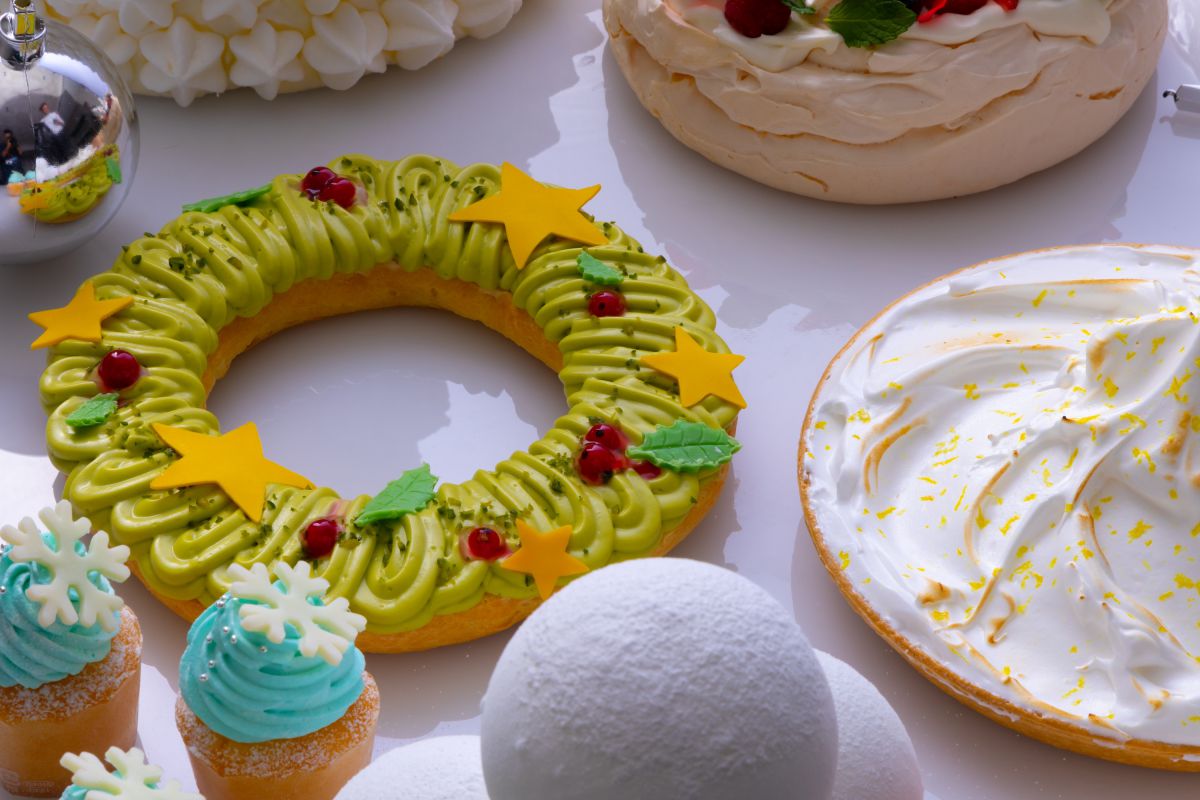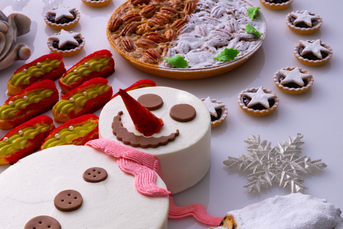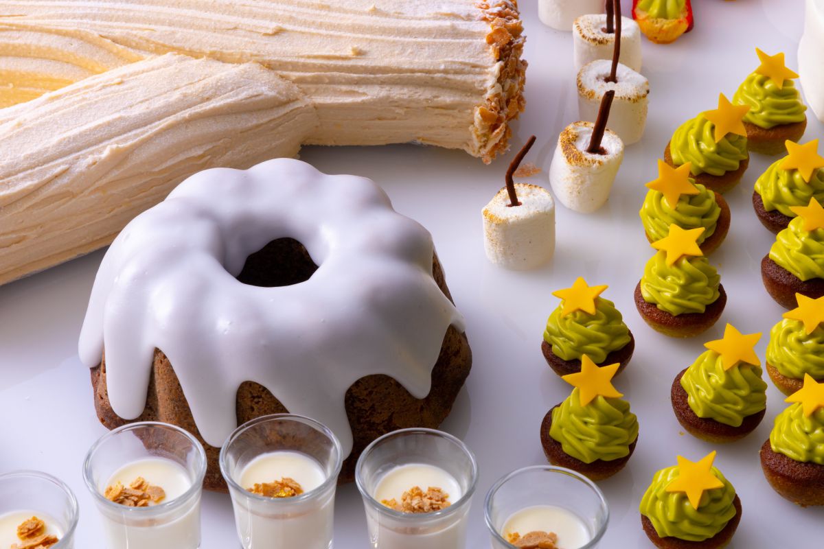 オーストラリアのクリスマスに欠かせないクグロフを雪山に見立てて白いシュガーのアイシングを施した「スノー・クグロフ」、ひと口サイズの「ピスタチオのクリスマスツリー」や「焼きマシュマロとチョコスティック」など、ビュッフェに並ぶスイーツは、かわいくってバリエーションもいろいろ。