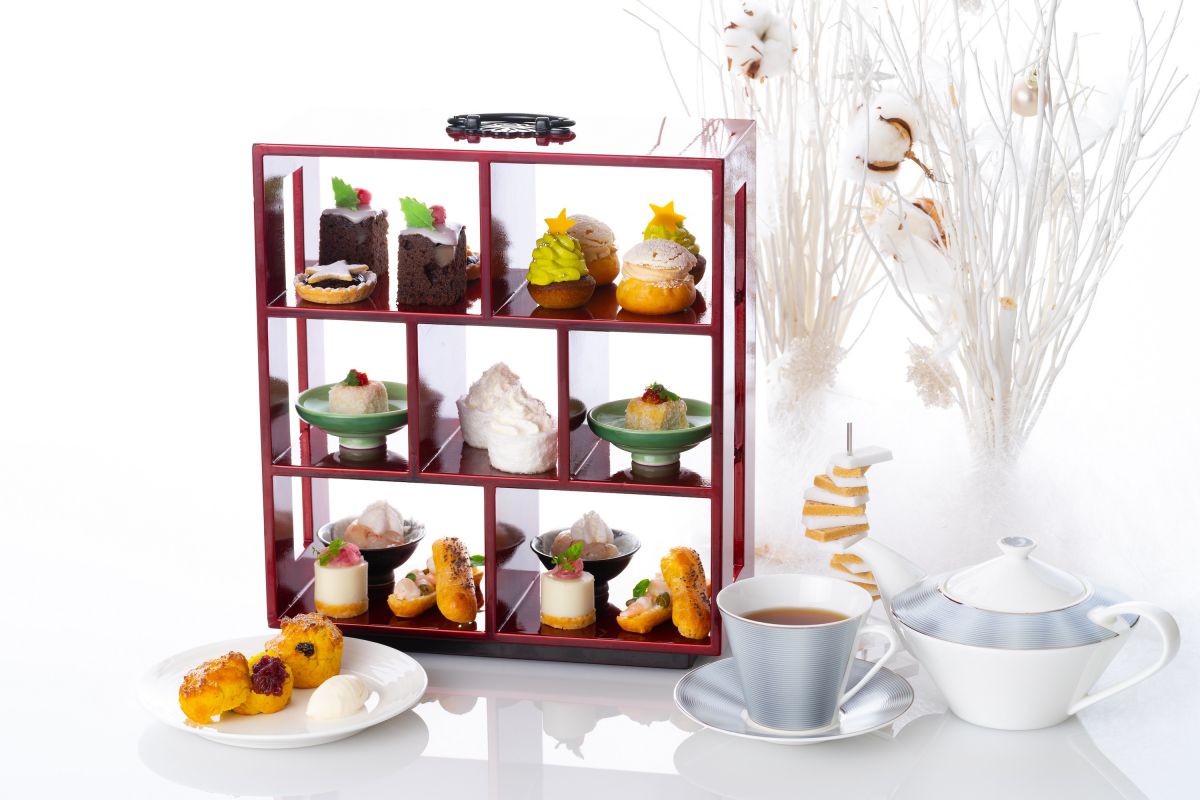 メレンゲの器に爽やかな柚子風味のココナッツクリームを絞った真っ白なスイーツ「スノー&ホワイト」、ラム酒に漬けたドライフルーツやクルミが詰まったスポンジに白いアイシングを施した「クリスマス・フルーツケーキ」など、6種類のスイーツと4種類のセイボリーの全10種類の白いアイテムが漆塗りのティースタンドに映えます。