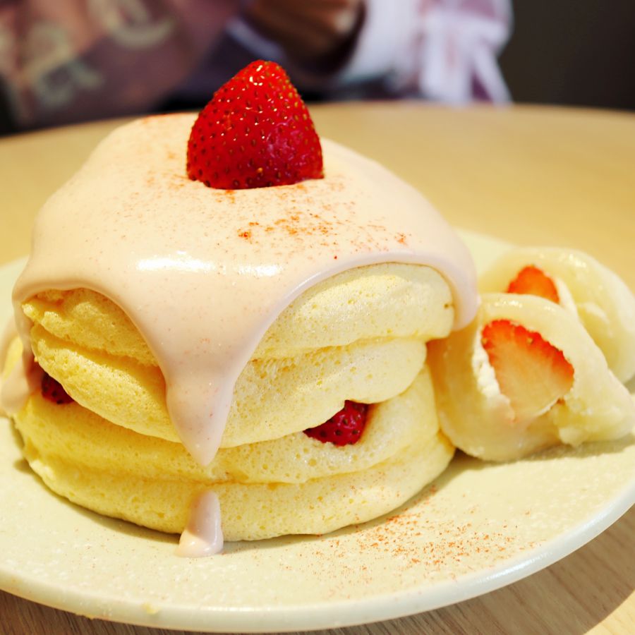 ふわふわで口どけの良いパンケーキの間には、甘酸っぱいストロベリージュレとチーズクリーム、フレッシュいちごがサンドされ、上にはミルキーなストロベリークリームがたっぷり。
