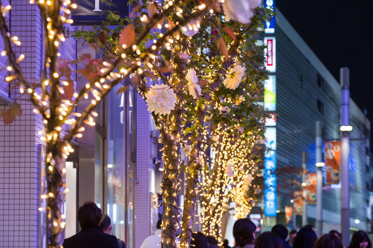 ”妖精探し”のラストスポットは、Flags前の並木道です。2種類のフラワーオーナメントと3色のゴールドLEDで彩られた街路樹は、新宿の街並を優しく、温かな光で満たしてくれています。そんな輝く光のなかに、ひっそり隠れる”花の妖精”も、街の賑わいにつられ夜になるとキラリと姿を見せてくれるでしょう。